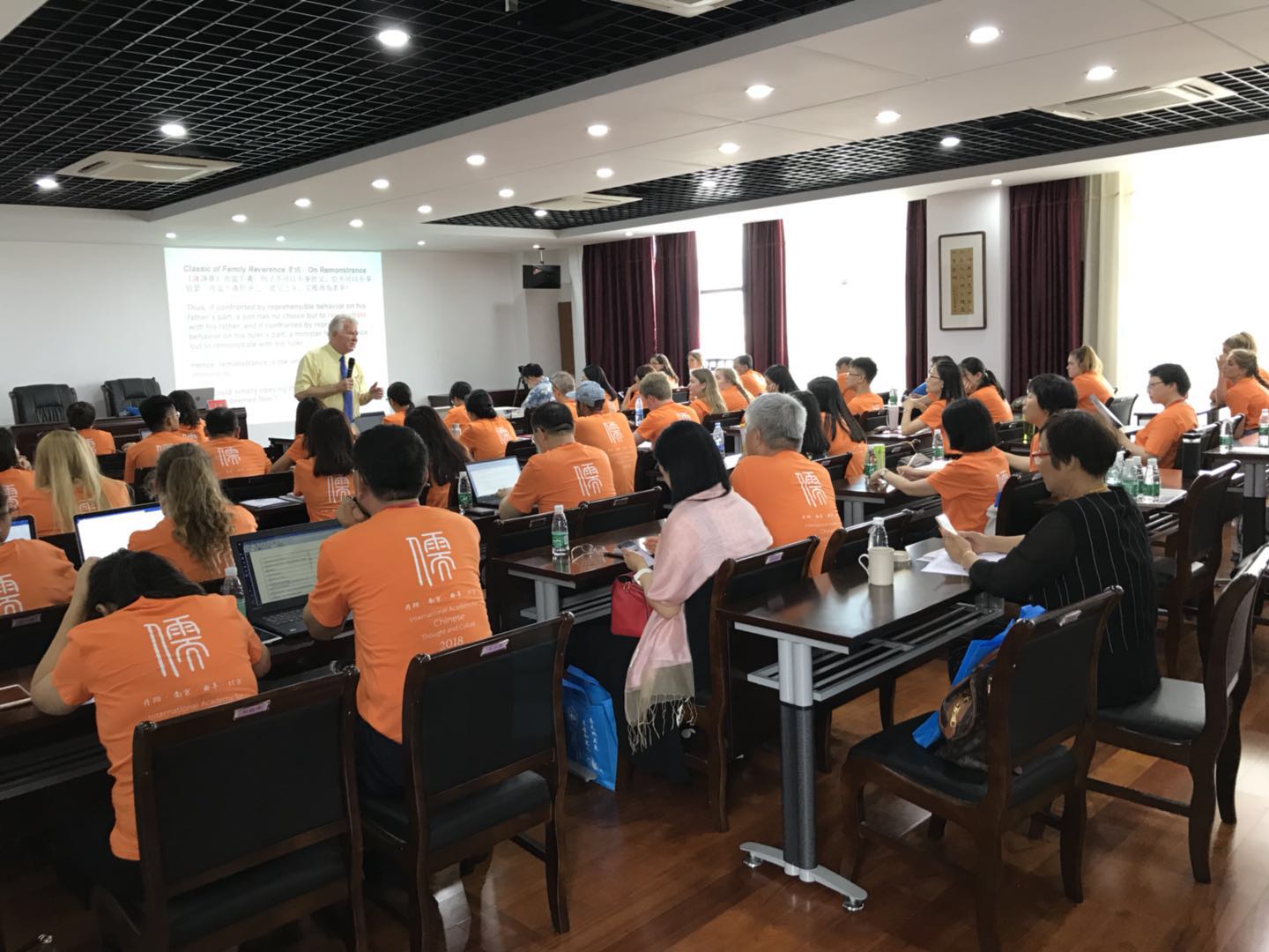 “2018年国际儒学与中华文化讲习班”由国际儒学联合会、北京外国语大学联合主办,由英国巴斯斯巴大学暨中国思想文化国际学院(IACTC)协办,北京外国语大学东西方关系中心、江苏省丹阳市中华传统文化协会、北外中国文化走出去协同创新中心和北京中外文化交流研究基地具体承办。讲习班旨在进一步推进以新时代历史感,用“一多不分”话语向世界阐释中国,为对外传播建设话语体系的新思路、新模式。"一多不分",是一切事物无不存在于互为联系的世界观;世界无一物是独立、单子个体;万物因相系不分而呈现浑然而一体。讲习班是著名比较中西哲学家、北京大学讲席教授安乐哲先生于2011年创办的“中华文化跨文化阐释”教学项目。