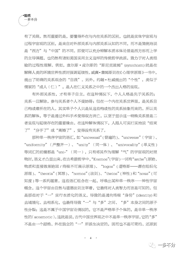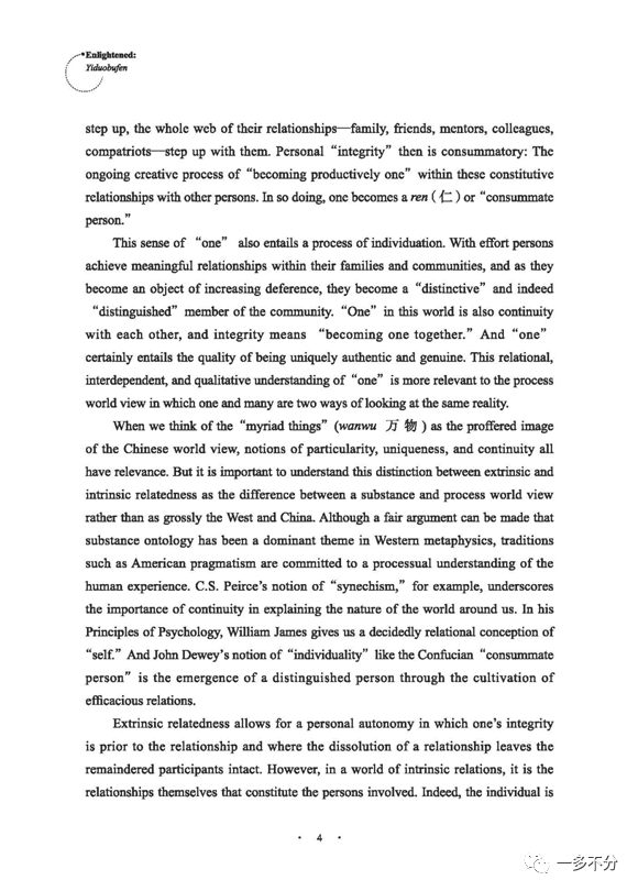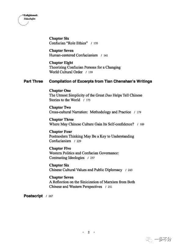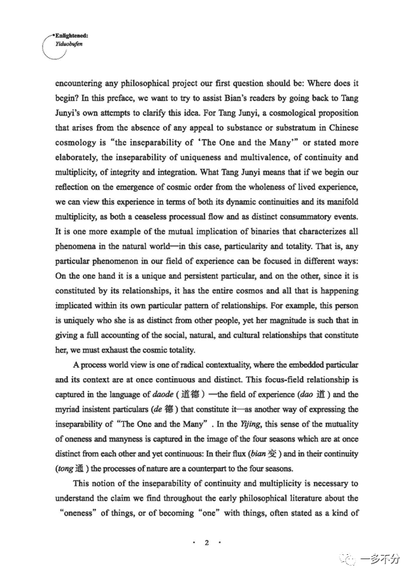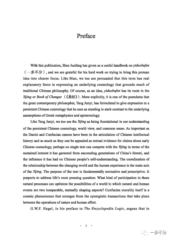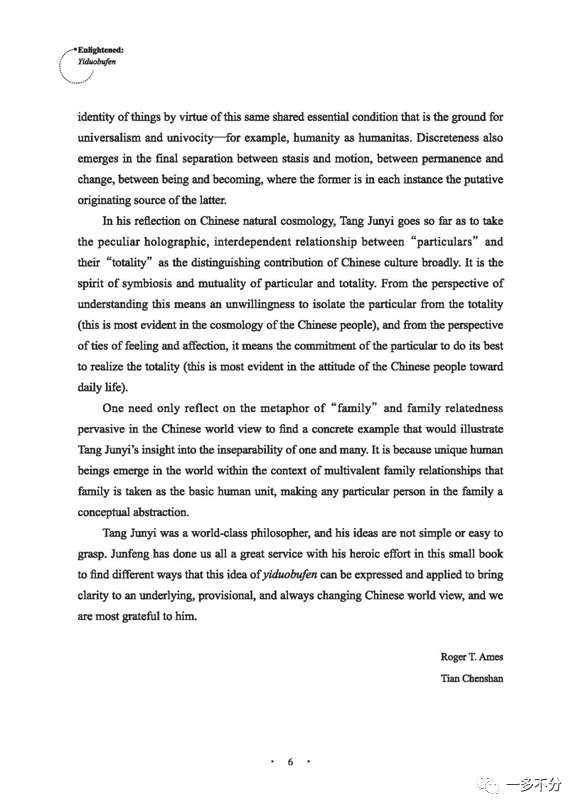 As a leading figure in the field of Chinese and Western comparative philosophy, Professor Roger T. Ames established a comparative interpretation method of Chinese and Western culture. From the broad perspective of Chinese and Western comparative philosophy, he profoundly explained that Chinese culture is one with the characteristic of yiduobufen, while the Western culture yiduoeryuan. He believes that the concept of yiduobufen refers to an endless dao (wholeness rather than a single order) cosmology. This book serves as a whole interpretation of “yiduobufen”. It could be divided into three parts: Roger T. Ames and yiduobufen; Compilation of Excerpts from Roger T. Ames’s Writings; Compilation of Excerpts from Tian Chenshan’s Writings. Each part is divided into seven to eight chapters, with each section containing an article on yiduobufen, yiduobufen tips and quotations from Roger T. Ames’s writings. The article excludes difficult and obscure language, yiduobufen tips provide space for readers to record their feelings and understanding, and after savoring quotations from Roger T. Ames’s writings, readers can grasp the essence of Roger T. Ames’s Thought. Yiduobufen emphasizes a community of shared future for mankind, and is conducive to promoting the “going global” of Chinese excellent traditional culture and is also a positive response to the “Belt and Road” Initiative.